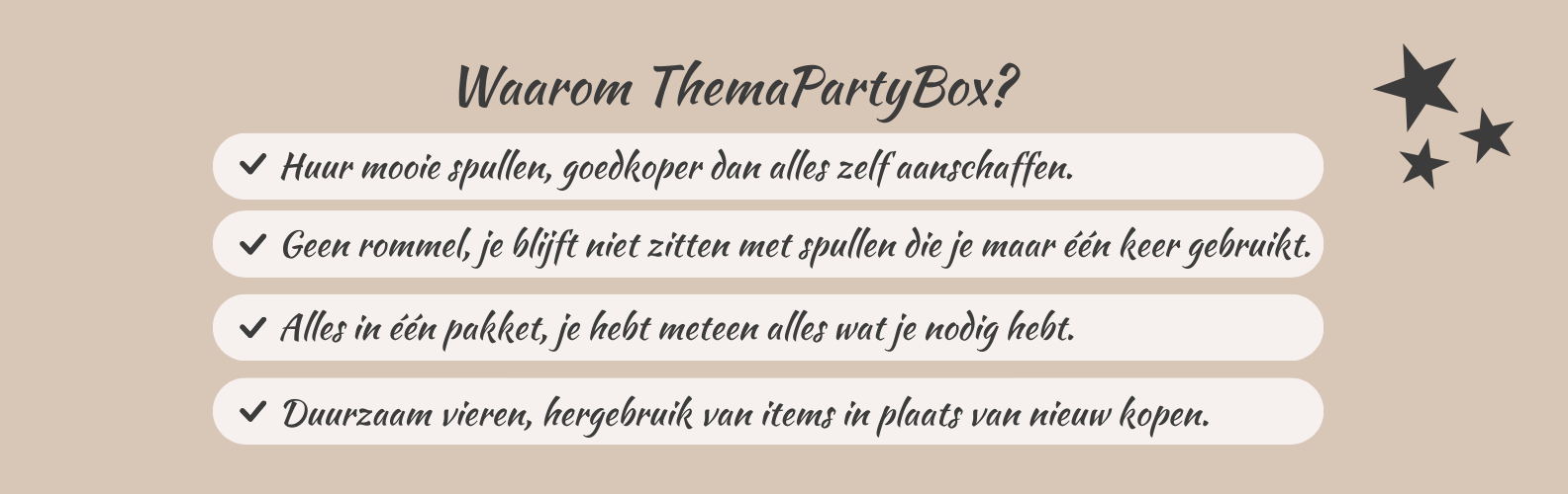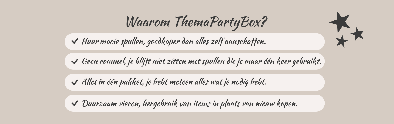 Bij Themapartybox huur je voor elk feest, stijlvolle feestdecoraties in één box.
